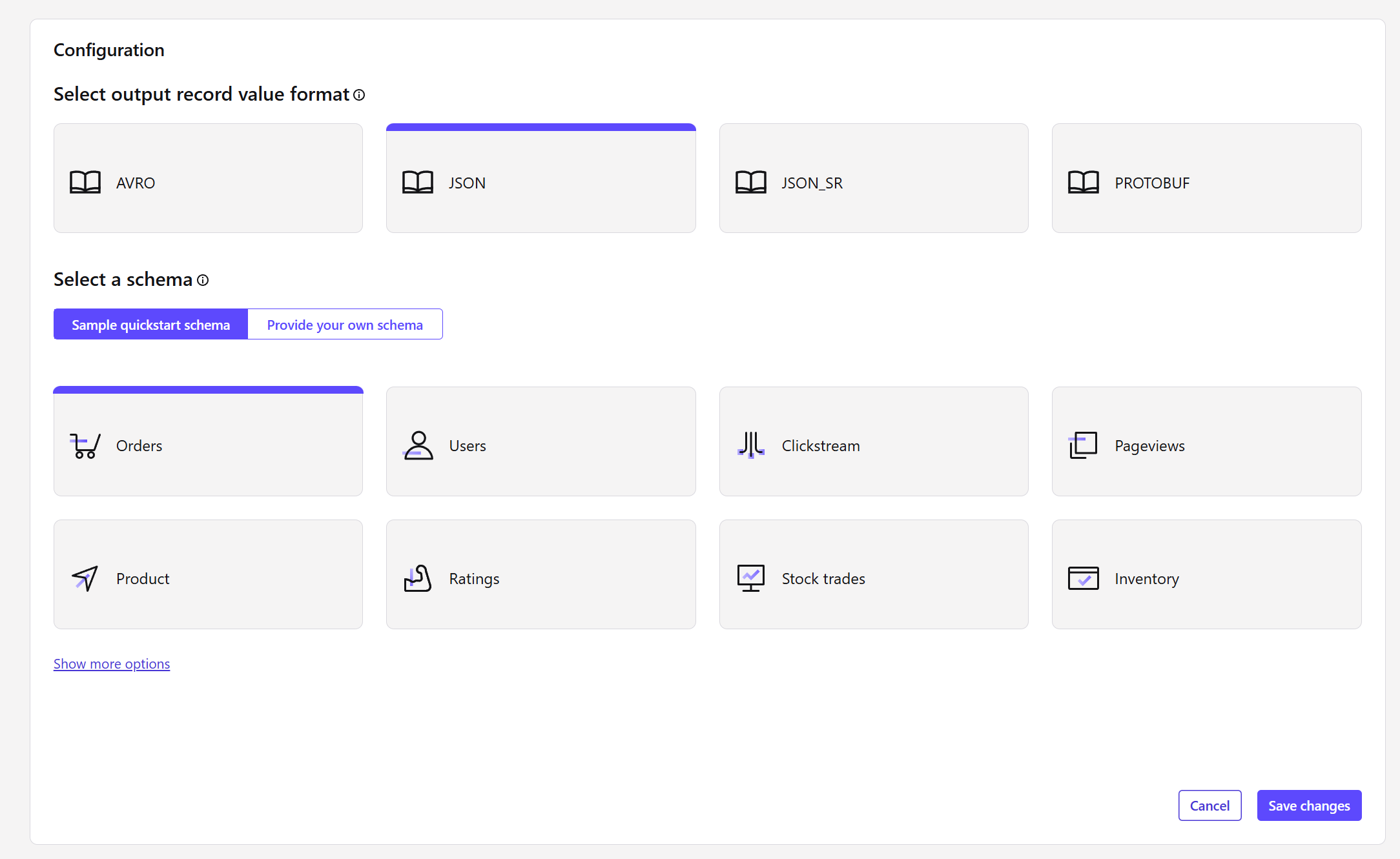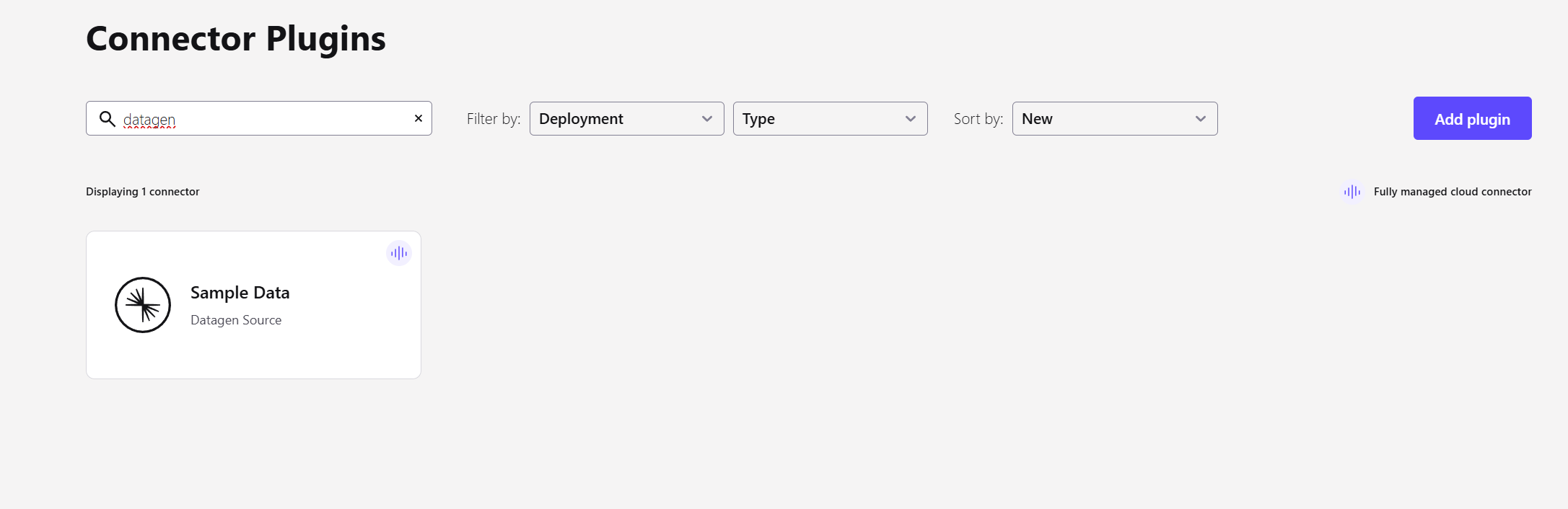 If you don’t already have data in your Confluent Cloud instance, then Confluent has a fully managed sample data generator – called the Datagen Connector plugin. Datagen can generate and publish realistic mock data into Kafka topics.