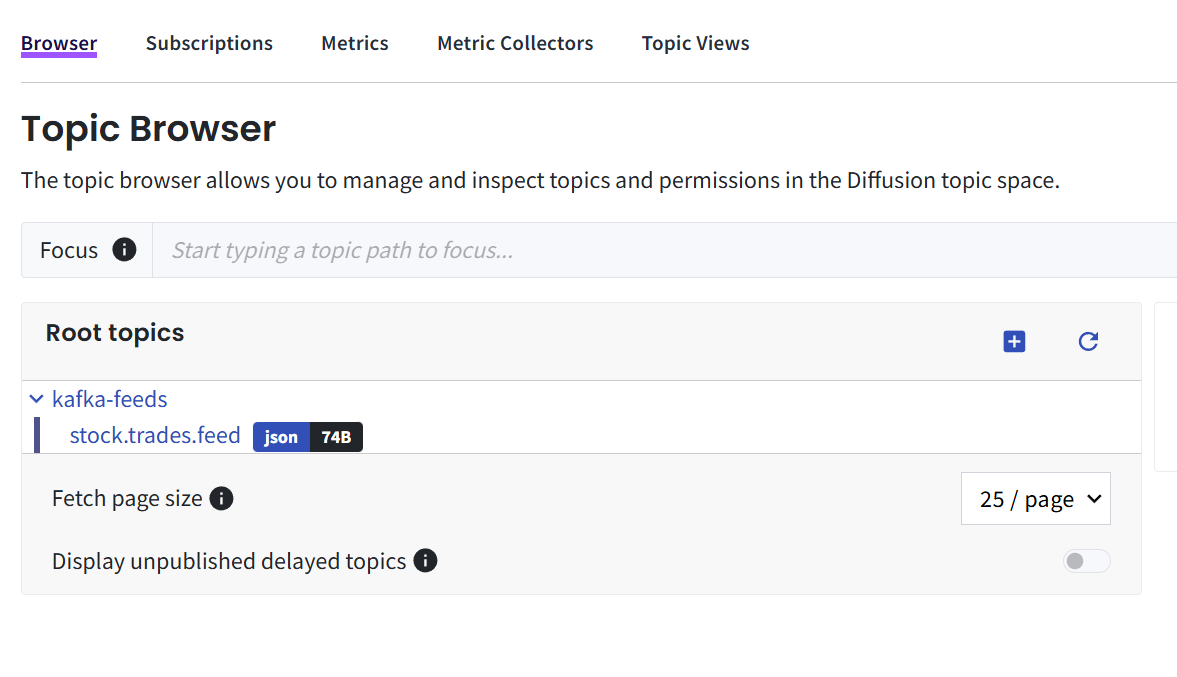 Note: The Diffusion console allows the topic(s) to be subscribed to in the form a a Diffusion subscription.