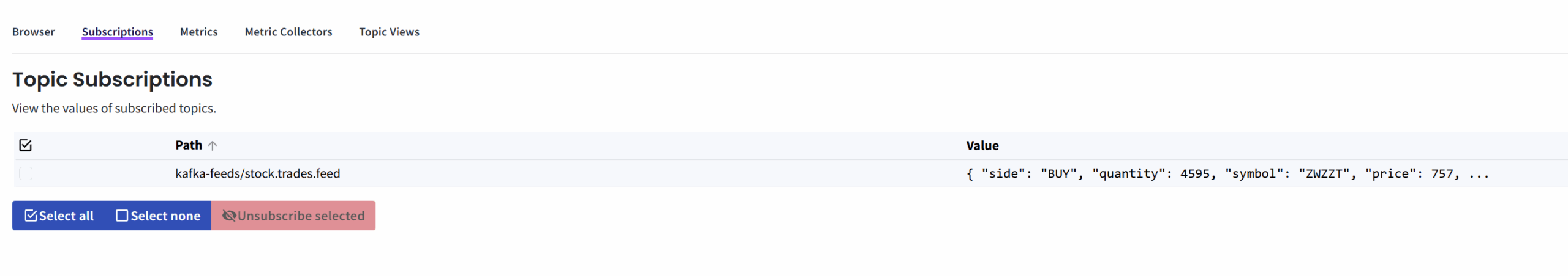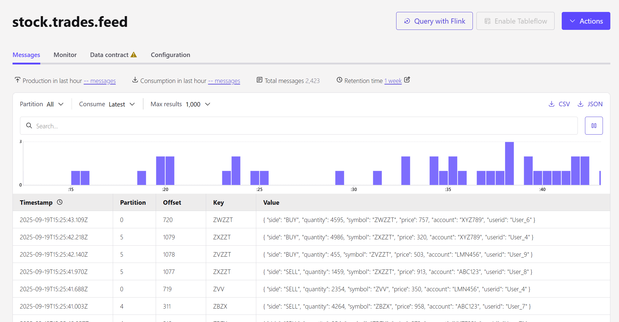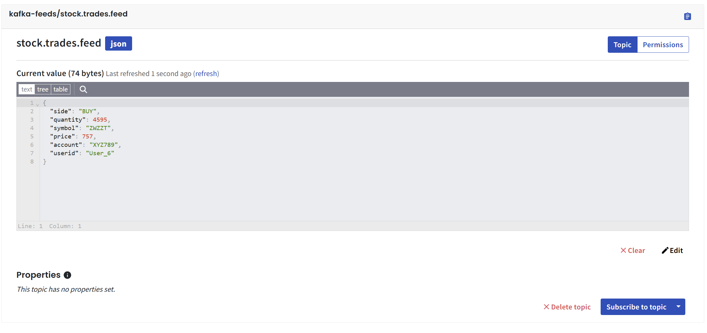 - The data for this example is published into the topic named ‘stock.trades.feed‘ and the messages can be viewed within Confluent Cloud.